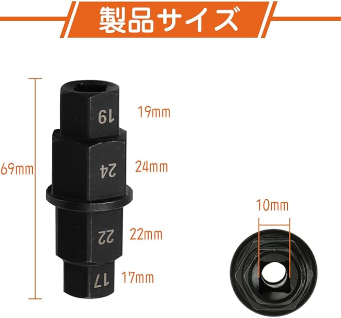 4種類のサイズ:17ミリ、19ミリ、22ミリ、24ミリのサイズで、開口スパナまたは3/8”ラチェットスパナと組み合わせて使用することができる。