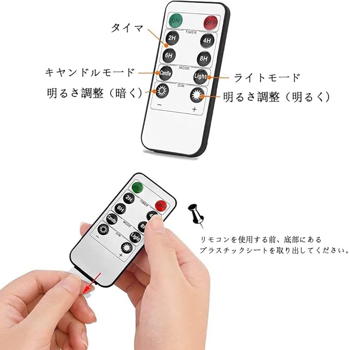 【使用便利】1) 2本のAA電池(含まれていません)を各キャンドルのバッテリーハウスに入れてから、「オン」スイッチに移動します。2) IRリモコン(CR2025電池を含む)を使って、タイマー機能などのキャンドルをコントロールできます。タイマーモード:2時間/4時間/6時間/8時間の自動消灯タイマー設定可, 1つのリモコンで距離が6M未満であれば、すべてのキャンドルをコントロールできます。