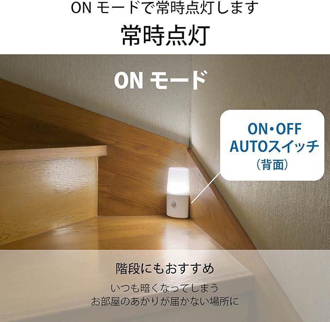 ●周囲が暗くなり人を検知すると点灯、離れてしばらくすると自動消灯 ●屋外でもご使用いただける防まつ形(IPX4) ●乾電池式で配線不要。電源のとれない場所や配線ができない場所におすすめです ●手動でON・OFFもできます ●常時点灯モード搭載