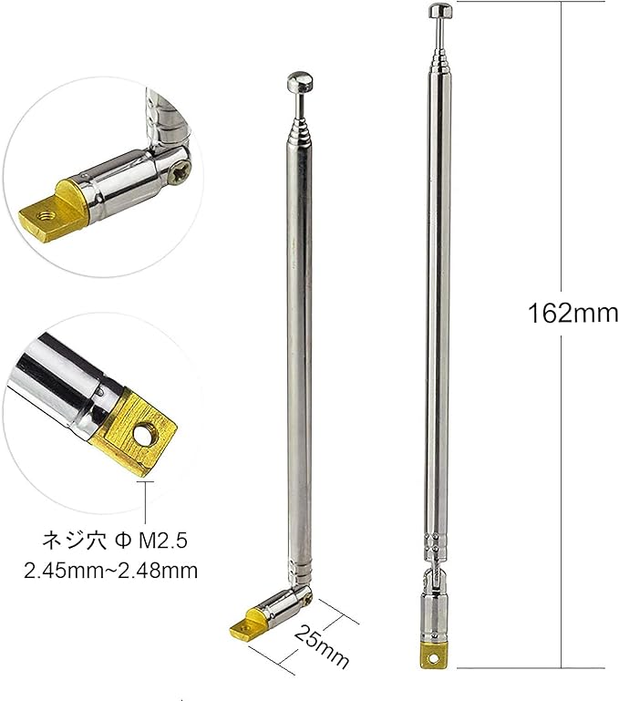 ステンレスと真鍮製の6段伸縮式アンテナ、アンテナの長さ:16cm~65cm、取り付け穴の直径:2.5mm。