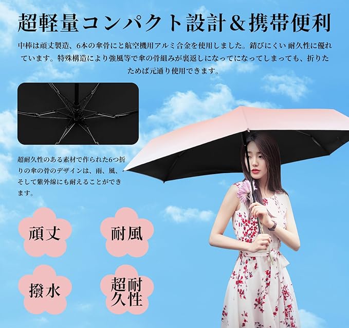超耐久性のある素材で作られた6つ折りの傘の骨のデザインは、雨、風、そして紫外線にも耐えることができます。