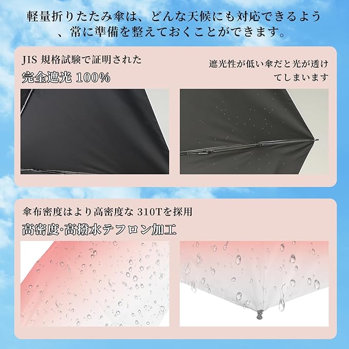 【超撥水性&晴雨兼用】✅ 本製品は310T超高密度のテフロンポリエステル材料を採用しします。片側には超撥水のテフロン加工も施されたので、優れた撥水性があり、軽く振るだけでほとんどの水滴が振り払えます。夏季でも秋季でも、超人気な超軽量の折りたたみ日傘です。強い風の日にも強い雨の日にも使われ、全天候対応できる便利な晴雨兼用の折りたたみ傘です。外出にぴったりの一品です。