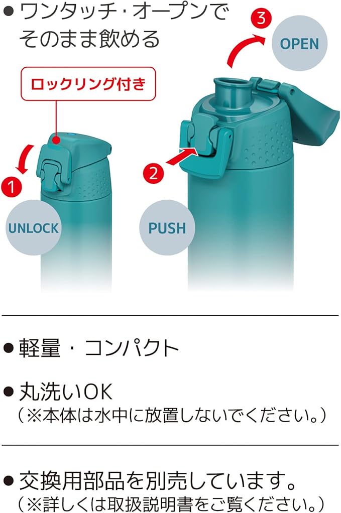 ●操作しやすい大きなロックリング。ワンタッチ・オープンでそのまま飲める