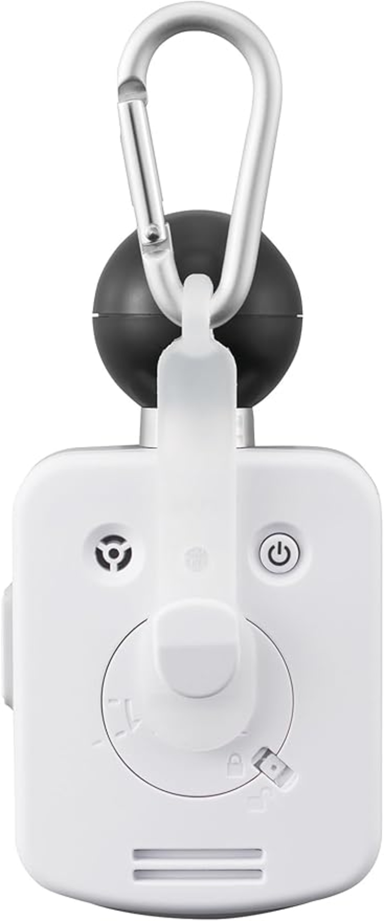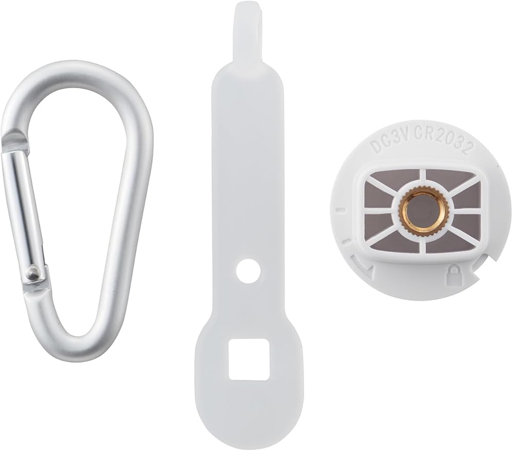 付属コンポーネント つり下げ用アタッチメント、カラビナ、 三脚取り付け用電池フタ、 お試し用電池(CR2032コイン形 リチウム電池)、保管用袋(本体梱包)、取扱説明書(保証書付)
