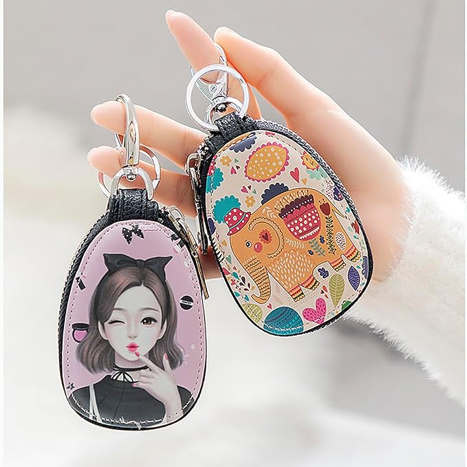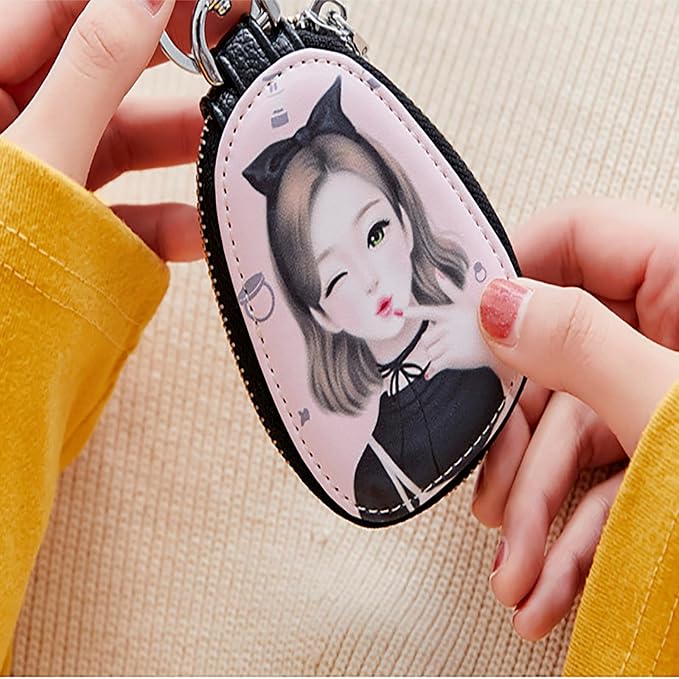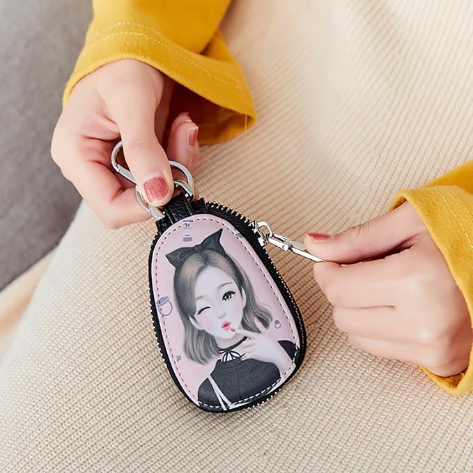 キーケース 小銭入れ PU革 スマートキー 車キーケース 収納 便利な多機能 ファスナー付き キーリング 男女兼用 (ショートヘアガール)