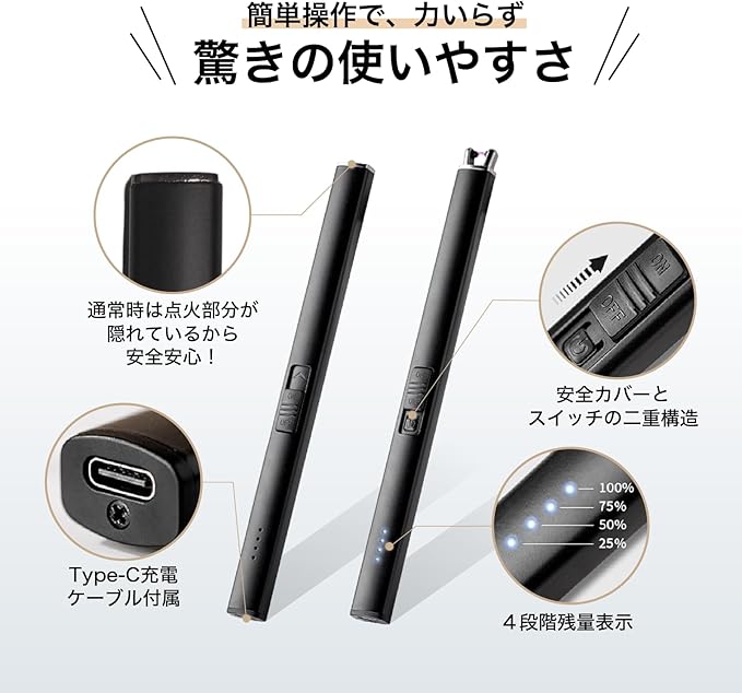オイルがなくて点かない、といった心配はありません。汎用性の高いType-Cで充電可能で、いつでもどこでも手軽に使用できるように設計されています。