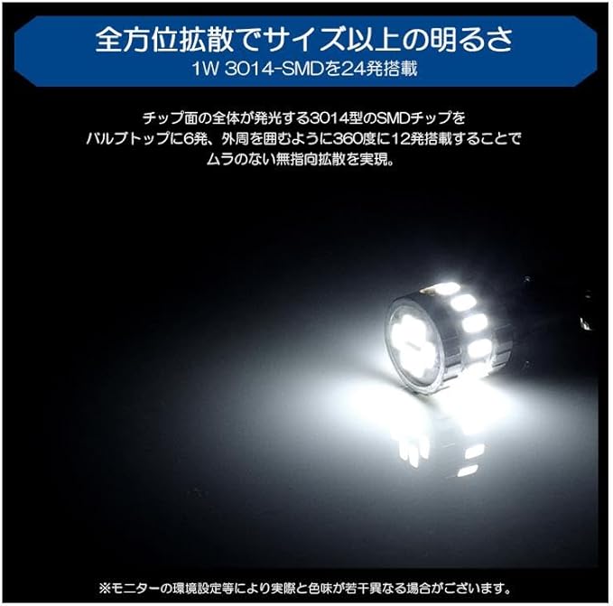 T10型のハロゲン球と同等サイズになりますので、形状が同じであればポジションランプ/ライセンスランプ/ルームランプ/カーテシランプなど幅広い箇所でお取付可能となります。