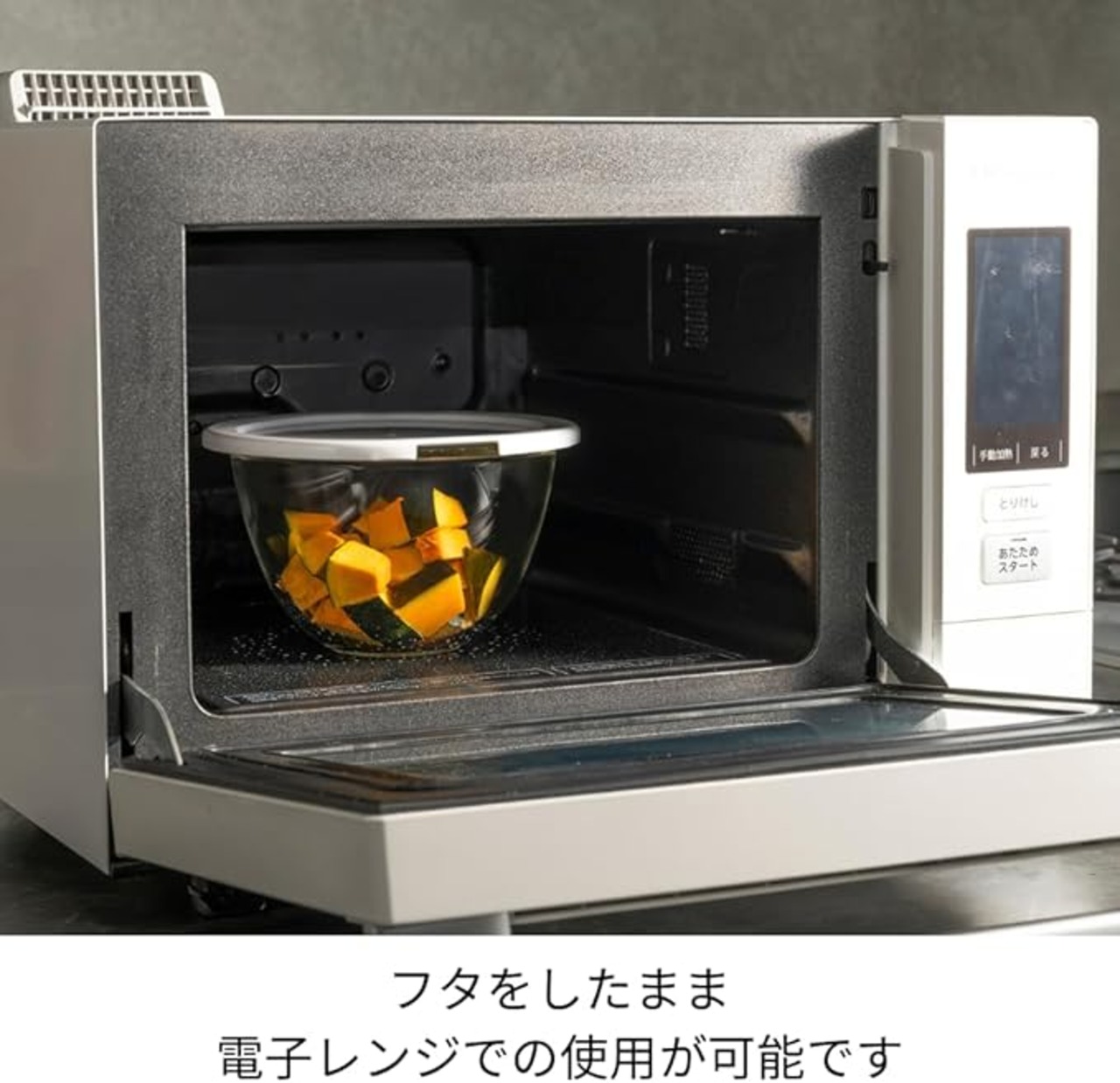 フタ付きの耐熱ガラス製ボールです。野菜の水切り、電子レンジ調理時のラップ代わり、冷蔵庫での保存に便利です。フタを外せばオーブンでの仕様も可能。深型設計なのでハンドミキサーや泡だて器で混ぜる際にも液体が飛び散りにくいです。ボールを重ねてスッリキと収納することができます。