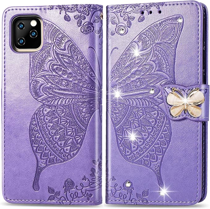 iphone 13 / iphone 14 用 ケース 手帳型 かわいい おしゃれ 蝶 蝶柄 きらきら ラインストーン 蝶々 デザイン カード 収納 ストラップ 付き 耐衝撃 アィフォン 13/14 スマホケース ハンドメイド 女性 優雅 純色 手帳ケース PUレザー 携帯カバー パープル