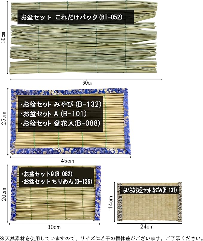 迎え火と送り火で焚く麻がら(おがら)、お供え物を盛っていただく蓮の葉、 机の上に敷くまこもが入っております。