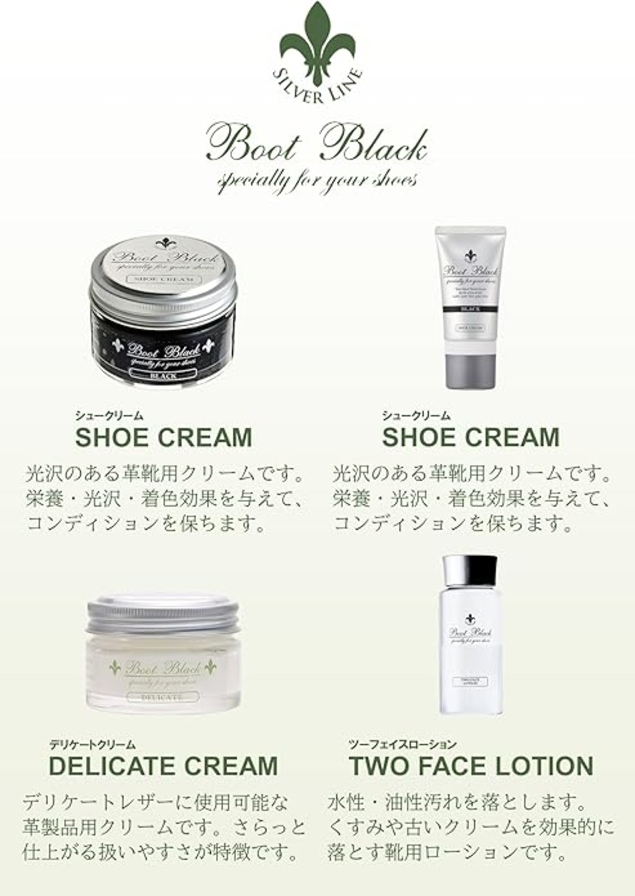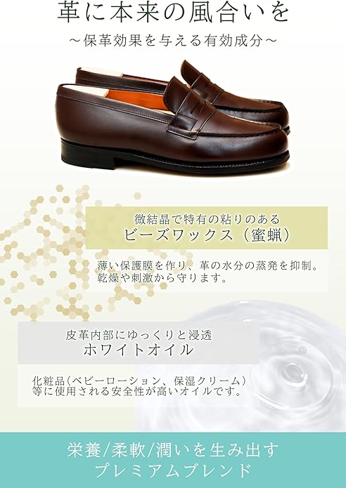 靴磨きの<プロ>が創り上げた靴クリーム。クリームの伸び、拭き取りの軽さ(布の走り)などの使いやすさと、皮革への優しさを追求した基礎シューケア用品です。90年以上の歴史が育んだワックスブレンド技術を活かした処方による光沢、保革はもちろん、磨き感に優れたシュークリームです。微結晶で特有の粘りのあるミツロウと、硬く高光沢の鉱物系ワックスが皮革表面に密着した滑らかなツヤを与えます。また、皮革内部にゆっくりと浸透するミネラルオイルを配合しましたので、優れた保革効果を与えます。55g入り