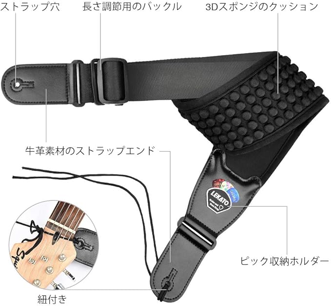 [LEKATO] ギターストラップ ストラップ ベースストラップ コットン製 エアクッション付 9.5cm幅 負担軽減 6枚ピックと2個ストラップロック付 黒