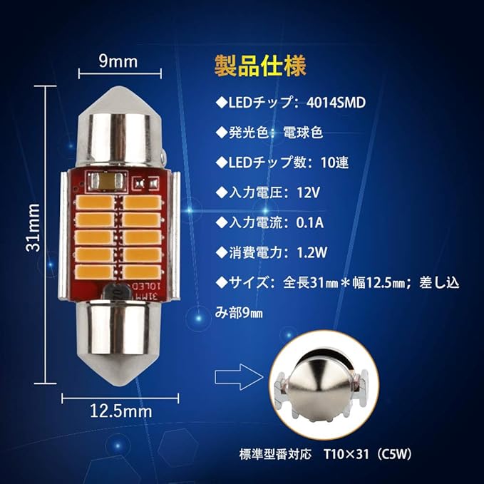 【製品規格】発光色:電球色 / 口金タイプ : T10 31(C5W)/ LEDチップ:4014SMD / LEDチップ数:10連 / サイズ:約31mm 12.5mm / 電圧:DC 12V / 電流:0.1A / 効率:1.2W / パッケージ:LEDバルブ 4、100日保証書 1