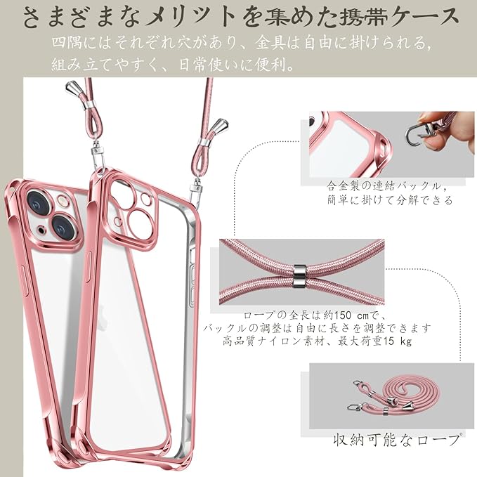 iPhone 15 Plus ケース クリア ショルダー 耐衝撃 iPhone15Plus カバー クロスボディショルダー 透明 アイフォン15Plus カバー 電気メッキ加工 ファッション設計 長さ調整 TPUスマホ ポータブル 落下を防ぐ 四隅の保護 (ローズゴールド)