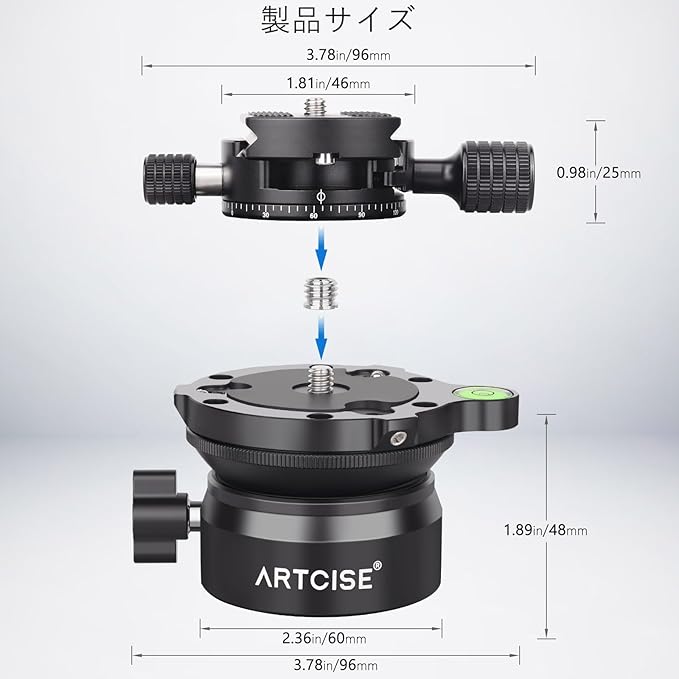 【360度パノラマパン】全景パンの上部ネジは1/4インチです。3/8インチ底部ネジ穴は1/4-3/8インチ変換ネジを安装できます。アルカスイス規格のアダプターを付き、これをパンの底部に安装して、すぐにArca-swiss規格の雲台のクイックシュークランプに安装できます。