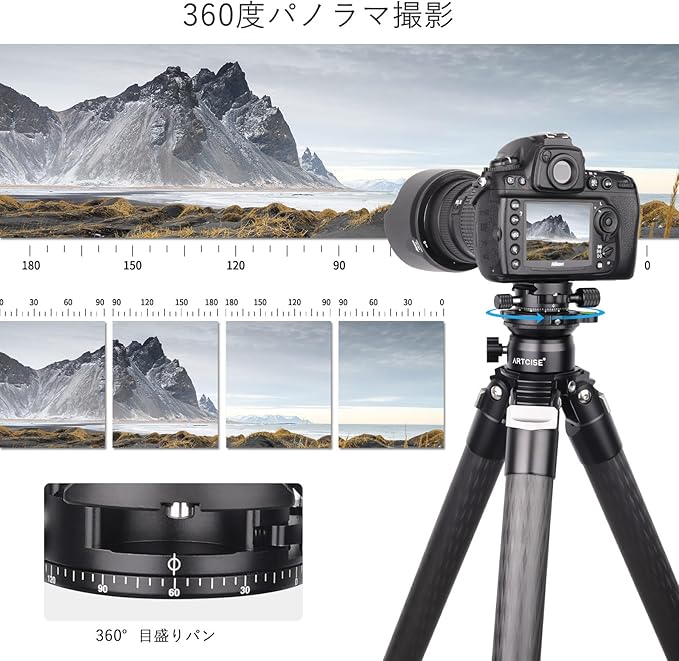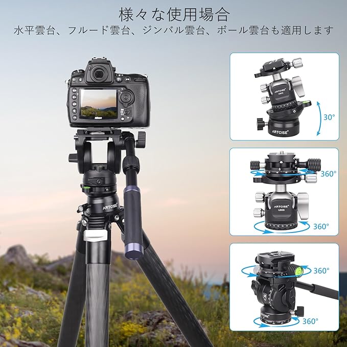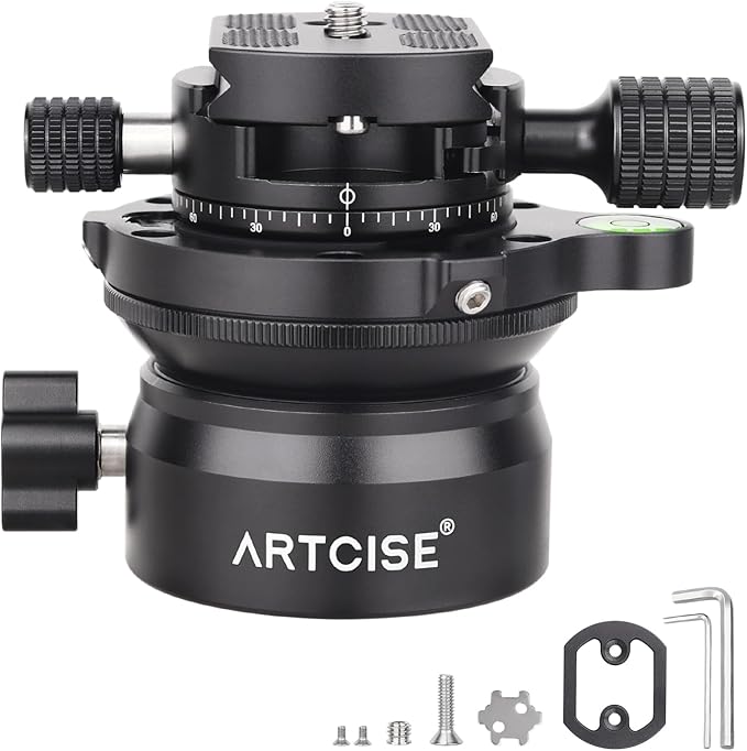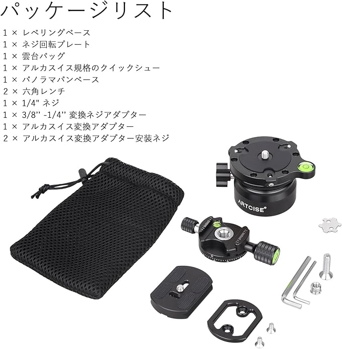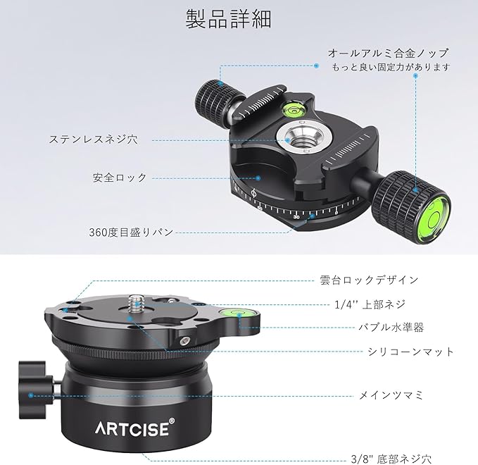 ARTCISE レベリングベース 三脚水平雲台+パノラマパンキット アルミ合金 速くて水平調整 三脚ヘッド +15 /-15 傾斜範囲 360度全景撮影プレート 最大耐荷重10キロ
