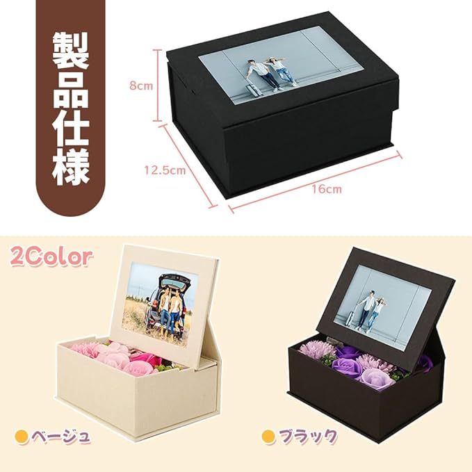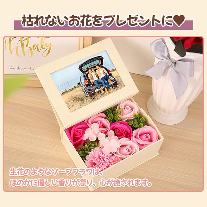 【写真入れ可能】フラワーボックスには一つのフォトフレームが付属しています。マグネットで写真を固定する。デザインで、手間をかけず簡単に写真を入れられます!お気に入りの写真や意味のある写真をフレームに展示されて、懐かしい思い出がよみがえります。記念写真や近況の写真にお花を添えて、感謝やお祝いの気持ちを込めて世界に一つの贈りものをしませんか!部屋飾りと玄関飾りなどもできますし、通常のフォトフレームとして使用することができますし、一石二鳥です。思い出の1枚を枯れないソープフラワーが永遠に彩ります!
