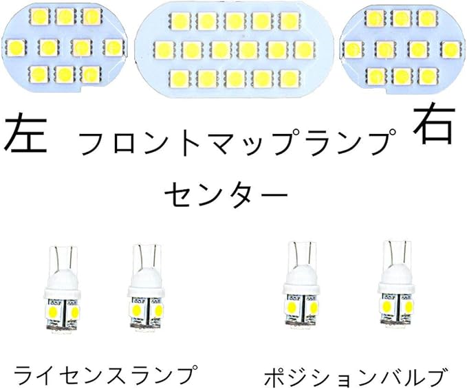 セット内容: フロント : 3連マップランプ SMD-LED 16LED 1セット 計16LED (センター) SMD-LED 10LED 2セット 計20LED (左右) ■ センター : セカンドシート の 上部 、左右 各1ヶ所  SMD-LED 21LED 2セット 計42LED ■ ラゲッジ :  SMD-LED 21LED 1セット 計21LED ■ ポジションバルブ : フロント   SMD-LED 5LED 2セット 計10LED ■ ライセンスランプ : リヤ  SMD-LED 5LED 2セット 計10LED 合計119LED ( 3chip=357) 取付専用工具 1, 製品説明書x1