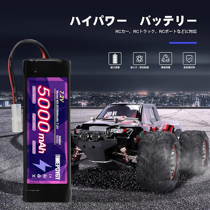 7.2V ニッケル水素バッテリー 5000mAh大容量 NiMH電池 タミヤプラグ付き多種類の RCカー(車)/RCトラックに適用 [CE,RoHS, MSDS,UN38.3認証済み]