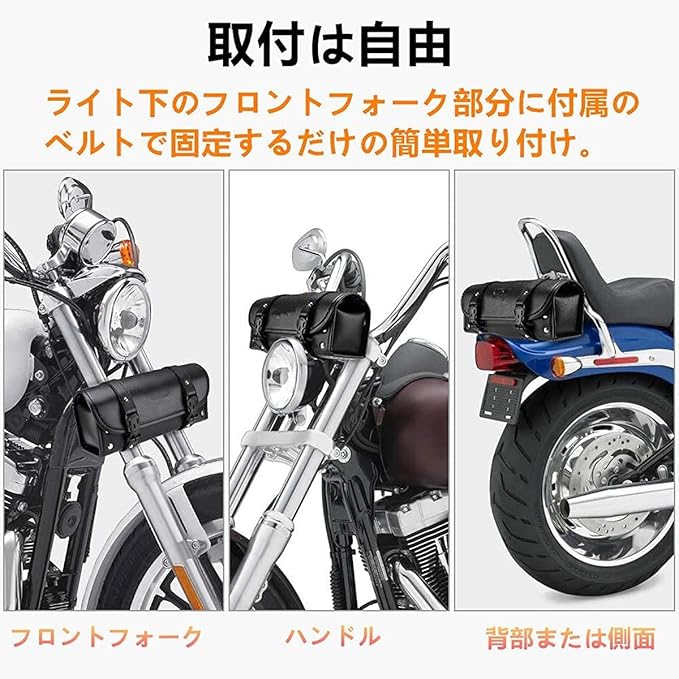 取り付けが簡単:ライト下のフロントフォーク部分に付属のベルトで固定するだけの簡単取り付け。バッグベルトの使用次第で バイクの前、後ろ、横側に設置ことが可能です。