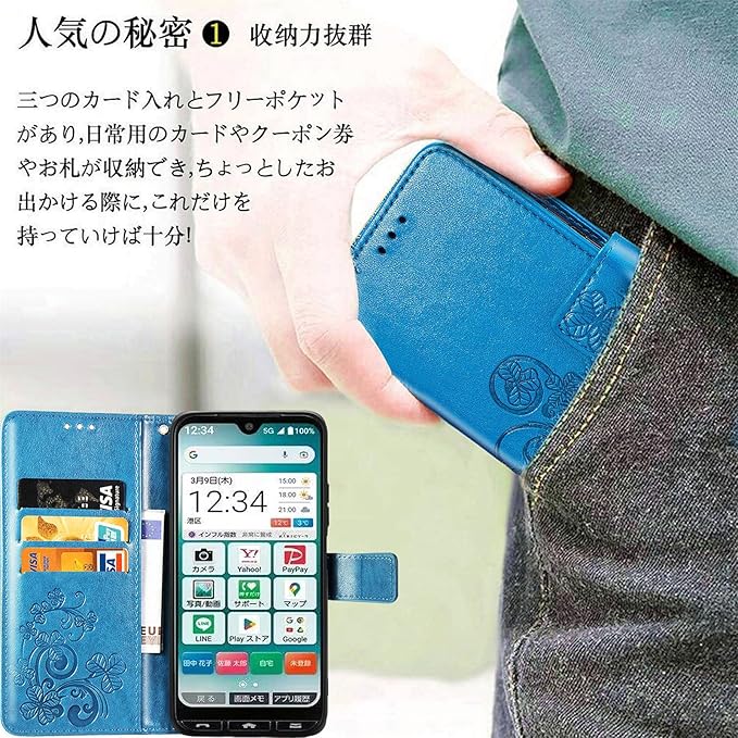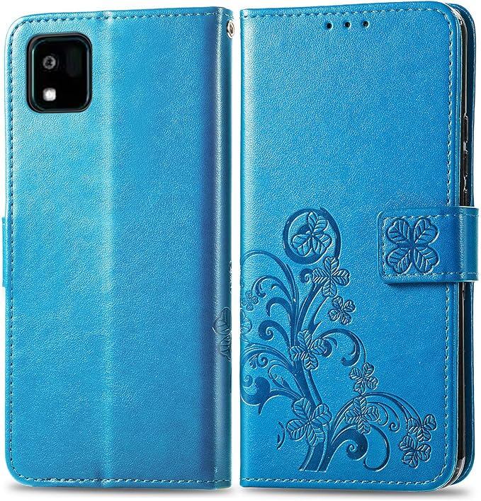 に適用するArrows We2 F-52E ケース 手帳型 ノートブック型携帯電話保護カバー多機能携帯電話ホルスター財布携帯電話ホルダーバンプパターンテクスチャ耐久性摩擦耐性携帯電話ケース男性と女性に適した多色オプション (四つ葉のクローバーブルー)