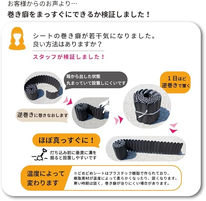 ■【特徴】芝の根止めや、オシャレな花壇づくりに最適な一体型のシートです!</br>一枚のシートなので、連結不要で土漏れが軽減します!</br>直線はもちろん、カーブやサークル用にも設置可能!</br>直角に曲げることもできます!</br>長すぎる部分ははさみでカットできます</br>