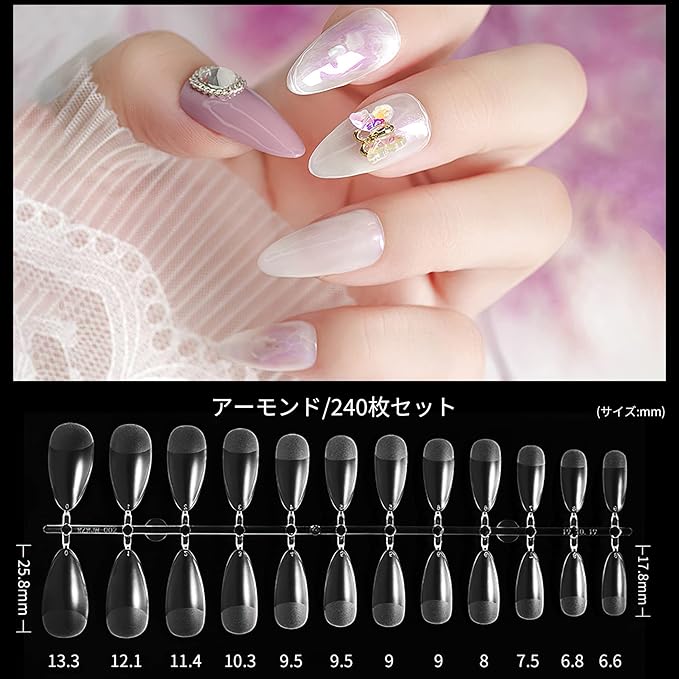 大容量で実用:アーモンド型ネイルチップセットです。12種類のサイズで様々な自爪のサイズに対応可能、合計240枚入り。付け爪、練習用どちらにもお使いいただけます。