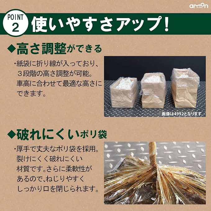 自動車、バイクのオイル交換に。吸収体に綿花を採用したことで吸油性能が大幅に向上。段ボールを使っていないので可燃ゴミとして処理が可能。紙袋に折り線が入っており、3段階の高さ調整が可能。