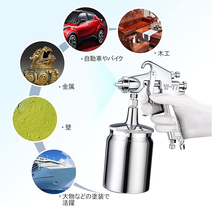 一般塗料対応: 一般的な塗料(水性塗料・油性塗料)に対応しており、多彩な塗装が可能です。しかし、塗料によってはエアースプレーガンで塗装できない場合がありますので、塗装HOTにご確認の上、ご使用ください。