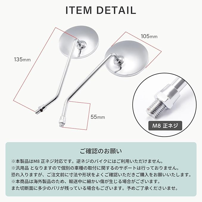 サイズ:原付きなどにあう 8mm ネジ 正ネジ ※逆ネジのバイクのミラーには直接ご利用いただけませんので、ご利用の際は別途アダプタをご用意ください。※ミラーの調節は、360度の回転のみの調節となりまして、上下左右への調節はできません。
