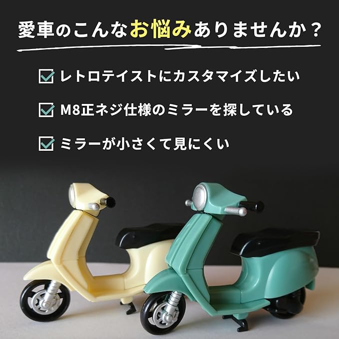 バイク を 旧車 テイストに: レトロ な ミラー は、往年のクラシックなデザインを彷彿させ、バイク のスタイルや外観を 旧車 風に カスタム することが簡単にできます。また、ヴィンテージな雰囲気が、バイクにノスタルジックな魅力を与えます。旧車のオフ会などの参加の際にも◎