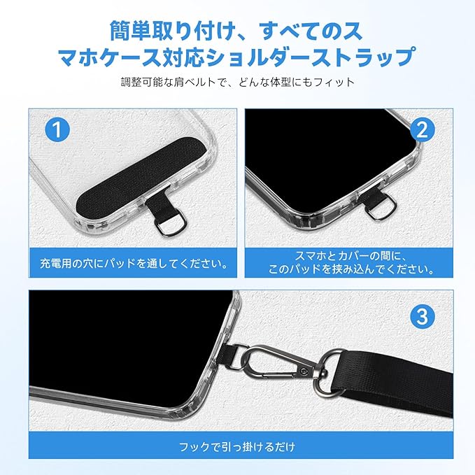 ストラップホールが無くても、全機種対応: 付属カードをお使いのケースに挟むだけ。機種を問わず装着でき、変更後も長く愛用できる高耐久ナイロン製スマホショルダーです。