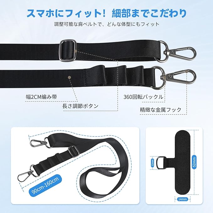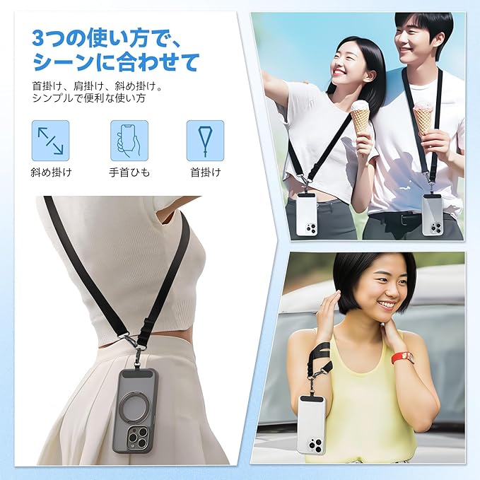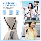 服装や体格に合わせ、長さ自在: 90~160cmで長さを無段階調整。その日のスタイルに合わせ、首掛けや斜めがけなど最適なスタイルで使えるスマホ ストラップです。