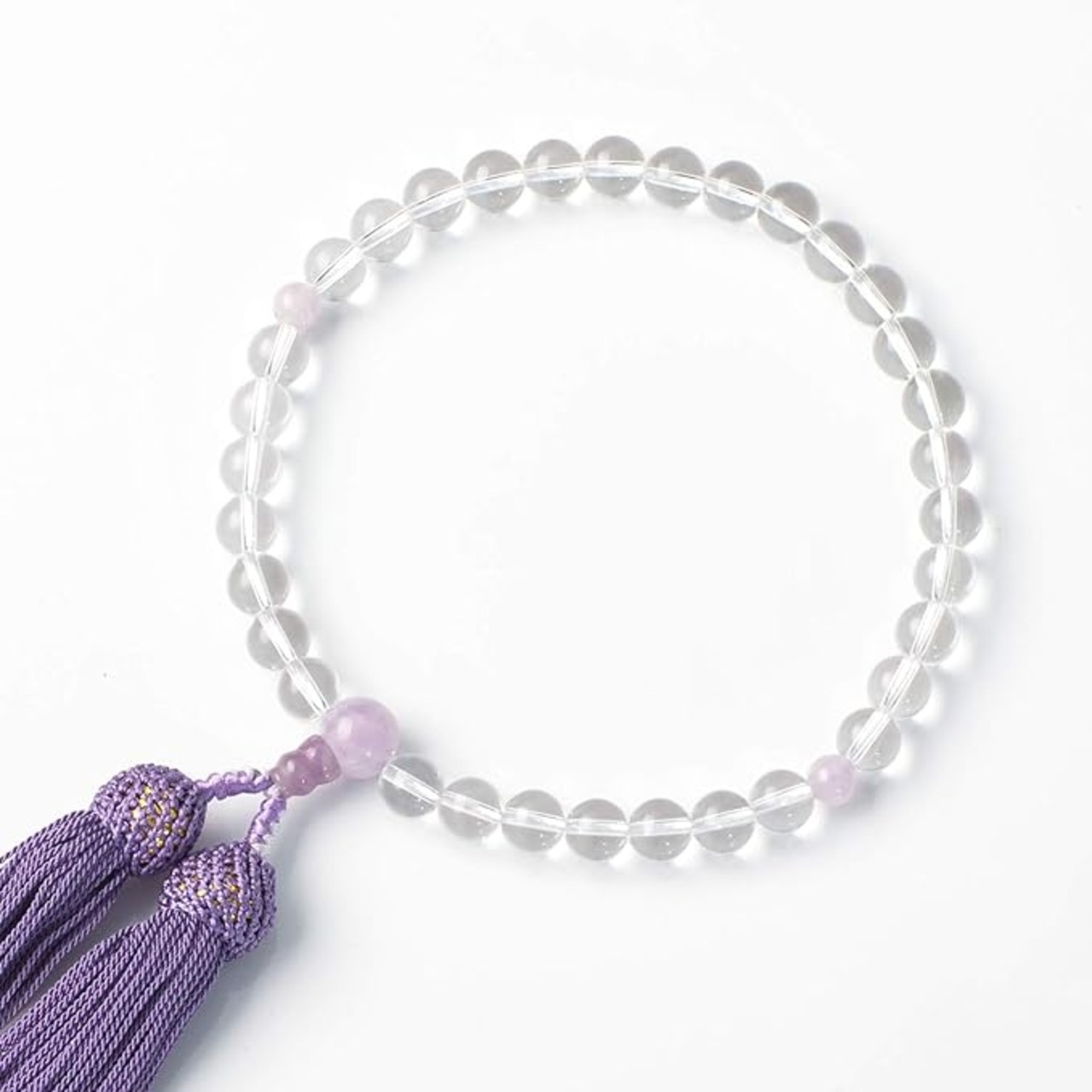 【エレガントな数珠】エレガントな水晶を使用しており、とても女性らしくて綺麗な念珠です。お値段から見えない高級感があり、上品な雰囲気を演出してくれます。