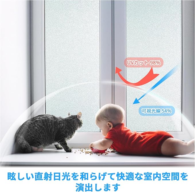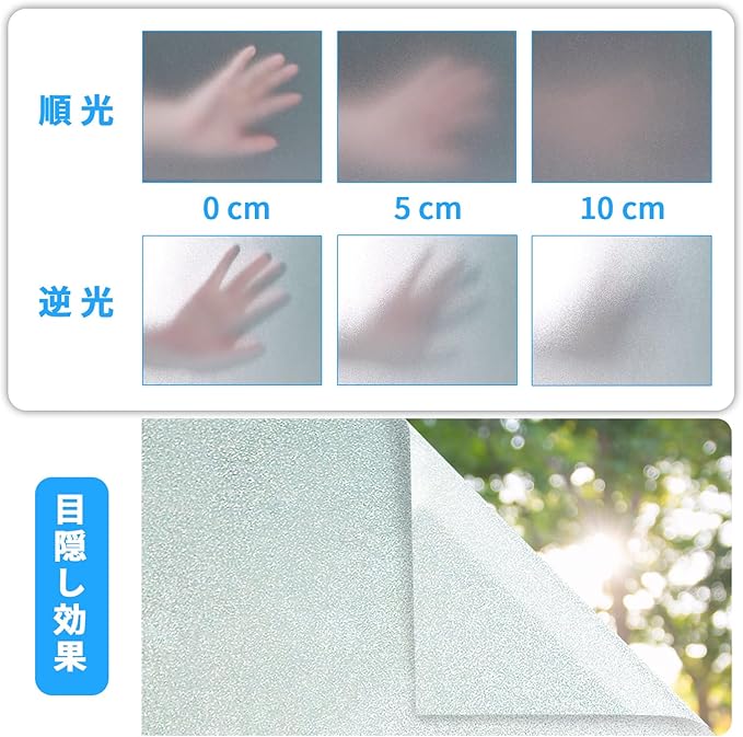 プライバシーを守りながら明るさをキープ:透明な窓にこの目隠しフィルムを貼ることで、外からの視線をしっかりシャットアウトし、日光を取り込んで明るい室内を実現します。使い方も簡単で、貼り付け後は何度でも再利用可能。自宅やオフィス、賃貸住宅にもぴったりです。【ご注意】 フィルムを貼る前に、必ずガラスに付着した保護フィルム(不要なフィルム)を剥がしてください。この手順をスキップすると、貼り付けたガラスフィルムが剥がれやすくなりますのでご注意ください。また、適用できるのは滑らかな表面のみで、粗いまたは多孔質の表面には適用できません。