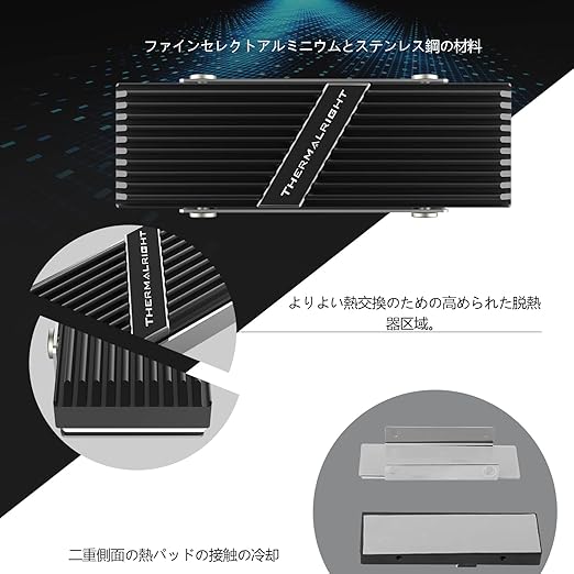 【アルミニウム合金】アルミニウム合金、サンドブラスト加工、アルマイト表面処理により、M.2 SSDの放熱面積を大幅に拡大し、10℃~30℃の放熱効果(環境により異なります)を発揮します。