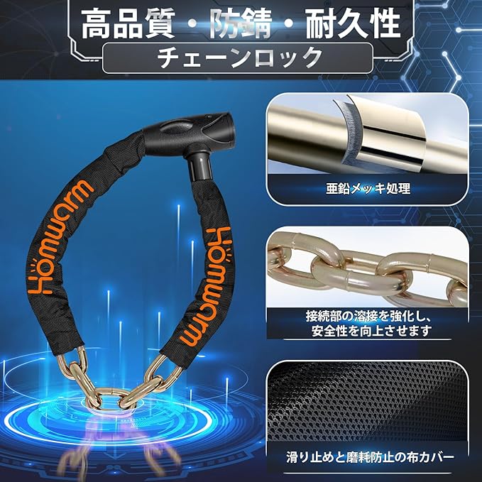 【防錆】チェーンロック本体と合金製チェーンヘッドは高品質の素材で作られています。防錆効果に優れた亜鉛メッキ処理で耐食性・防錆性抜群です。チェーンの表面には防塵用の布カバーがあり、摩耗を防ぎ、車の塗装を傷つけません。湿度の高い環境でも錆びにくいので、どんな天候にも耐えられ、確実な保護性能を実現。
