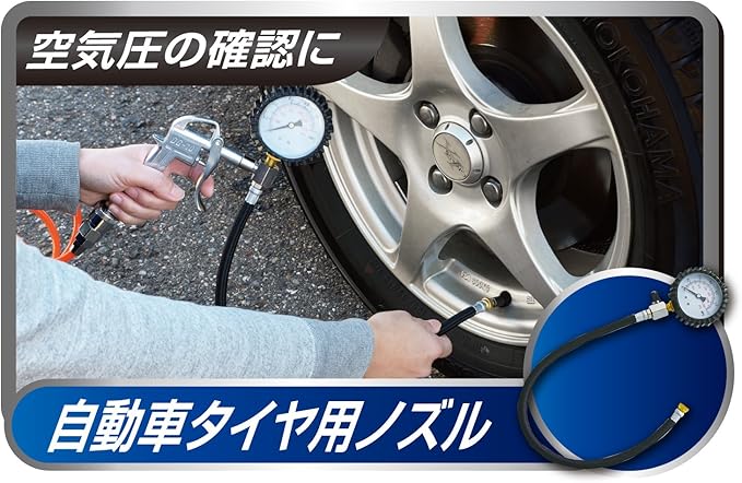 セット内容:自動車タイヤ用ノズル、エアーホース(約5m)、自転車タイヤ用ノズル、エアーダスター、ボール用ノズル、伸縮ノズル、ゴムボート用ノズル