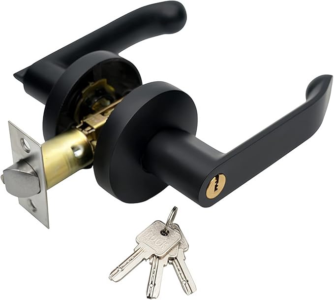 堅塁金物 ドアノブ 鍵付き 室内 浴室に適用 ブラック レバーハンドル 亜鉛合金の主体 三つの鍵 適用扉厚30-50mm ラッチは60mmあるいは70mmに調整可能