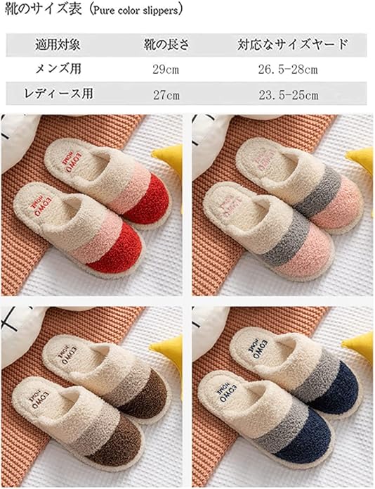 人気の4足セットルームシューズ、四つの色があり、二つのサイズが2足ずつ入って、メンズ用2足:29cm , レディース用2足:27cm