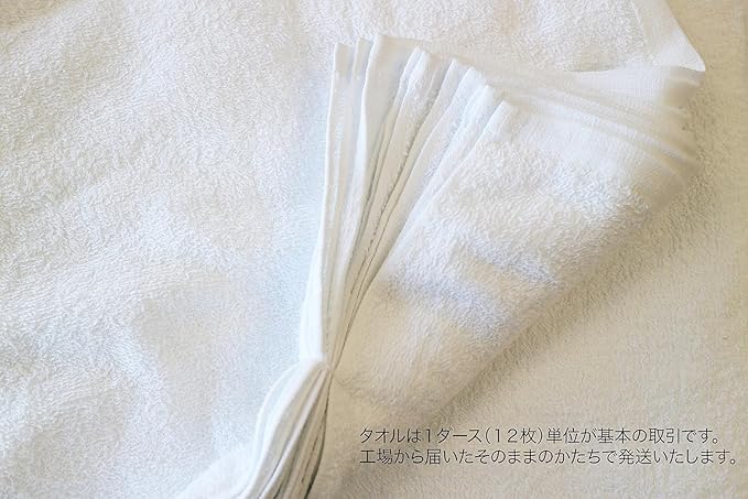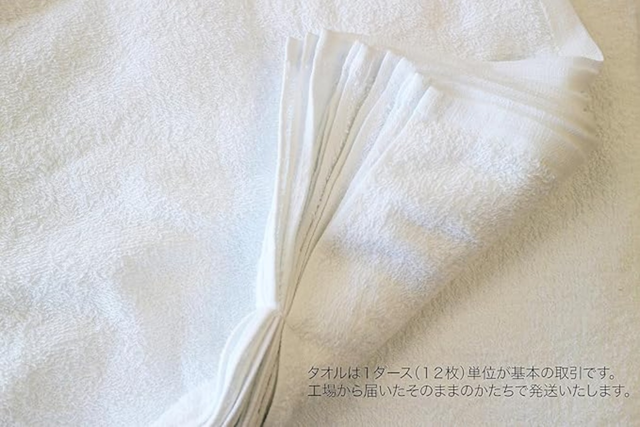 業務用や普段使い用として人気の【白フェイスタオル12枚セット】です。 ■何にでも使いやすいタオル 200匁は粗品用として使用されることの多い厚みのタオルです。 ほどよく薄いため、濡らしても絞りやすく、また乾いた状態でも使えます。 ■白タオルのメリット 一般的なフェイスタオル(約80cm)よりも長め(約86cm)のため 頭や首に巻いて汗取りにもおすすめです。 薄いのでモタモタしない、乾きやすいと白タオルならではのメリットも! 綿100%なので、安心して使用できます。 濡らしても乾きやすいため、いやな臭いが発生しにくいのもポイントです。 ■柄のない白タオル 使うタオルを白で統一したい方にもおすすめです。 リーズナブルな値段でまとめて取り替えられるため気分も一新できます。 汚れてきてもわかりやすいため、取り替えの目安にもなります。■平地(平織り)部分のない総パイル 粗品用限定商品タオルでは、プリント部分がパイルのない平地になっている場合が多いですが この商品は使い心地重視の総パイル仕様です。 パイルがあることで、平地部分よりも吸水性、肌触りが良いため気持ちよく使用できます。 【サイズ】34 86cm 【カラー】白 【素材】綿100% 【生産国】中国 【仕様】12枚セット、200匁(約62g/枚)、総パイル(平地部分なし)