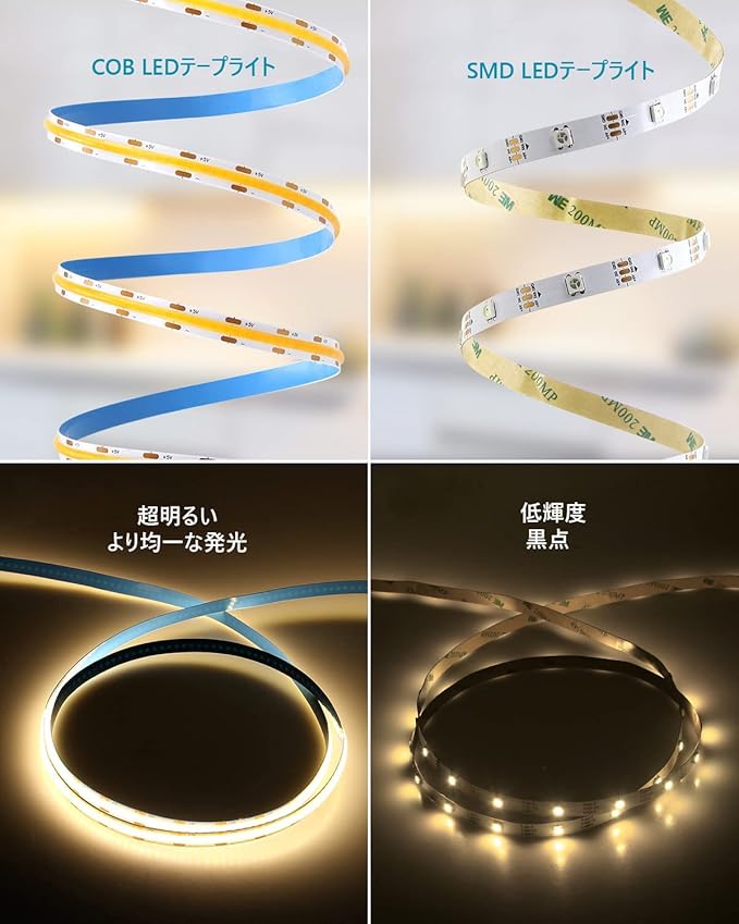 「自由に接続・切断可能」:このCOBテ一 プLED はカットライン(2.5cmごと)に沿ってカットすることができます。 また、貼り付けとカットが可能なため、様々なニーズに合わせて、好きな長さと形を実現する自由度が高いです。最強の粘着剤と8mm幅で、キャビネットの装飾、エッジフック、ワードローブなどの狭い場所にも簡単に取り付けることができます。