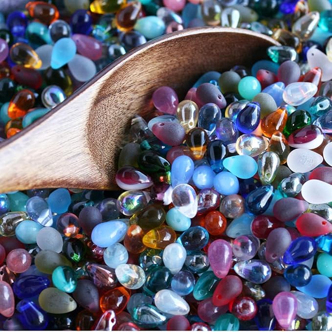 チェコガラスビーズのドロップ9 6mmおよそ100個をランダムカラーでセットにしたアソート商品