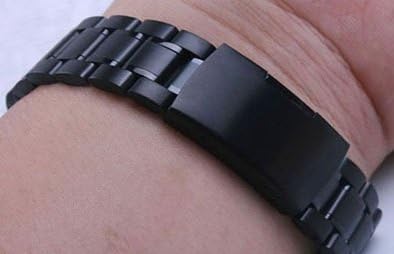 ヘアーライン(半艶)に2本ラインのポリッシュ(光沢)が入った、シンプルなブラックコンビ色で、肉厚な無垢コマを使用した重厚感有る仕上げです。