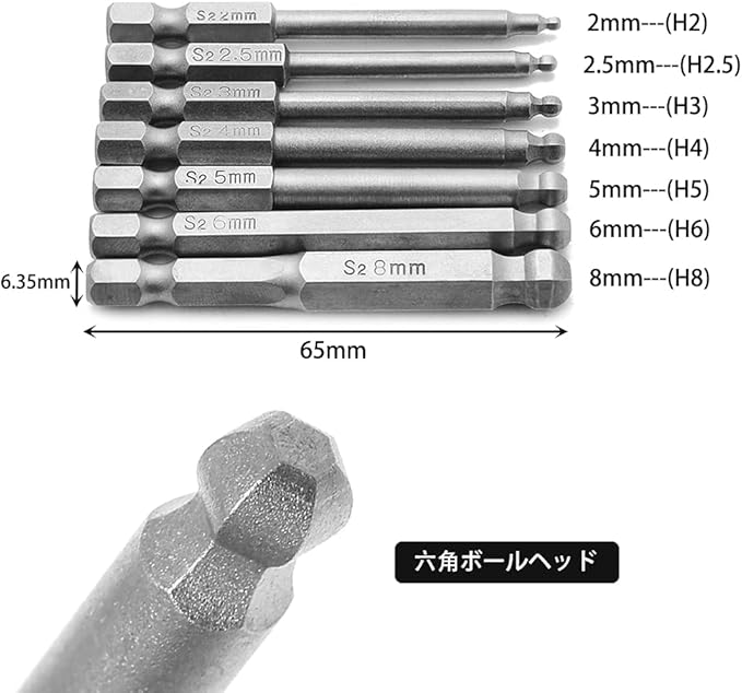 【ボールポイントビット】全長: 65mm、軸径: 6.35mm六角軸、サイズ:2/2.5/3/4/5/6/8mm。数量: 合計7個。