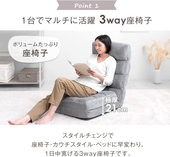 【スタッフのおすすめポイント!】・シーンに合わせてスタイルチェンジ!3way座椅子 座椅子・カウチ・ベッドにスタイルチェンジ ・大人かわいいニュアンスカラー ・もこもこキルティングで座り心地◎ ・リクライニング42段階+ヘッドリクライニング5段階 ・高い品質と耐久力を誇る日本HOTのギア使用 ・肌触りの良いマイヤー生地 ・折り畳み収納OK