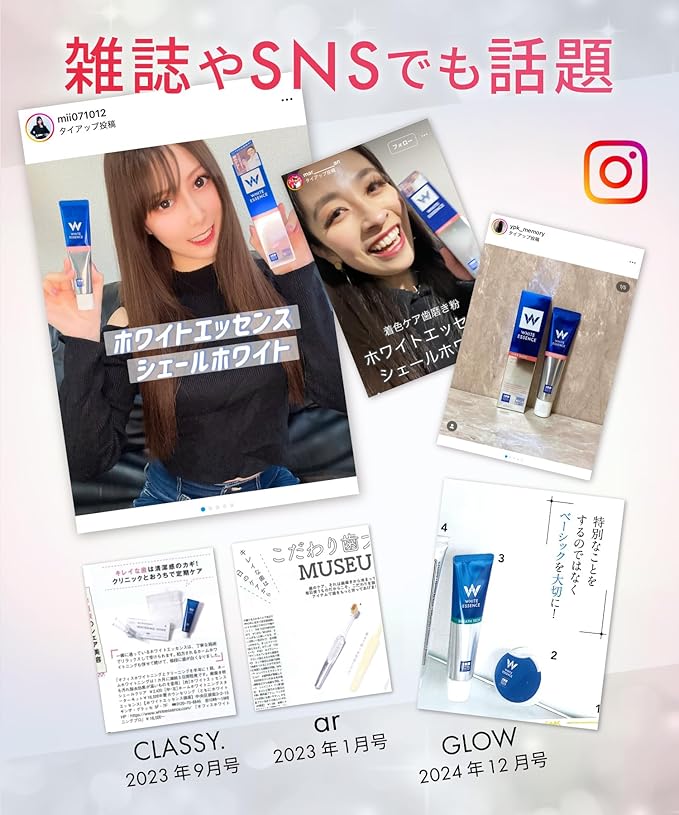 【SNSで人気】ホワイトエッセンスの商品は、Instagramなどでも多くのインフルエンサーから高評価をいただいています。※「Vine先取りプログラムメンバーのカスタマーレビュー」は、当社が試供品を提供したカスタマーによる評価