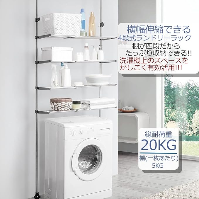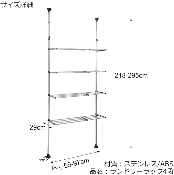 使用サイズ(約):幅55-97X奥行29X高さ218-295cm、自宅の洗濯スペースに合わせ棚を無段階調節できる、つっぱり洗濯機ラック。