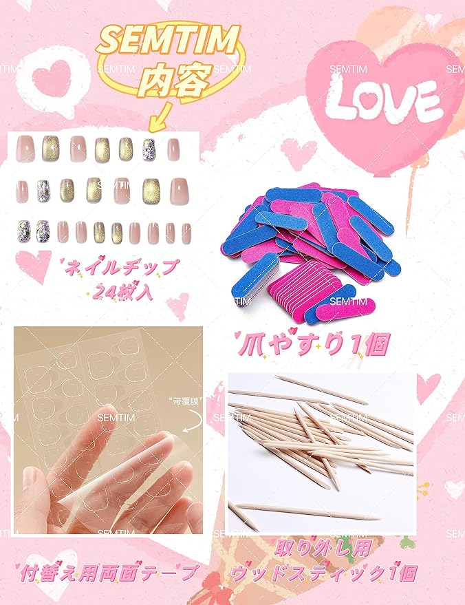 1.内容:ネイルチップ24枚+付替え用両面テープ+取り外し用ウッドスティック1個+爪やすり1個。