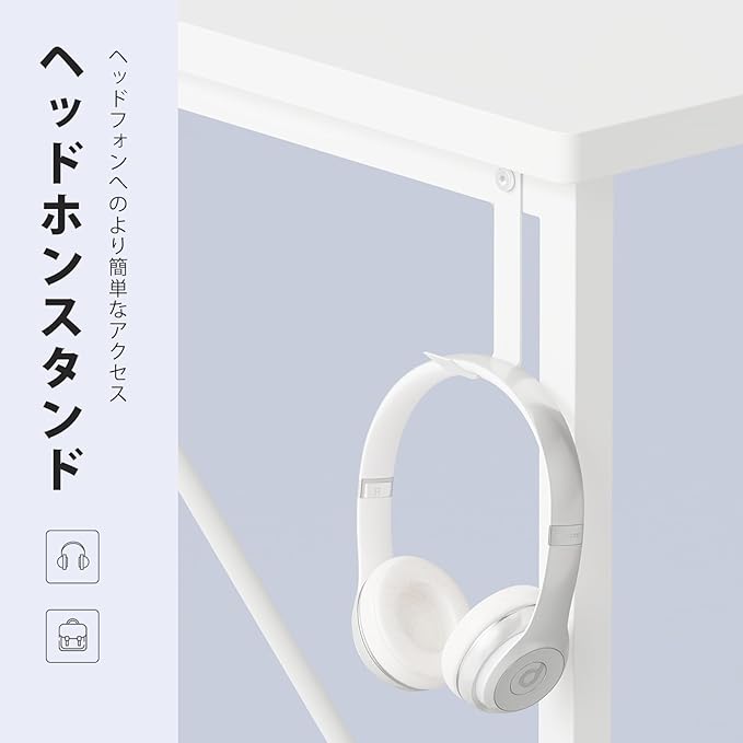 【大きな作業台と収納スペース】デスクの上は大きいので,パソコンと周辺機器を並べて置くことができ、手元がゆったり使える広さがあります。デスクは丈夫な収納袋とフックが付いておりますので、書類、カバン、ヘッドフォンなどの収納がとても便利になり、天板がすっきり片付けられます。